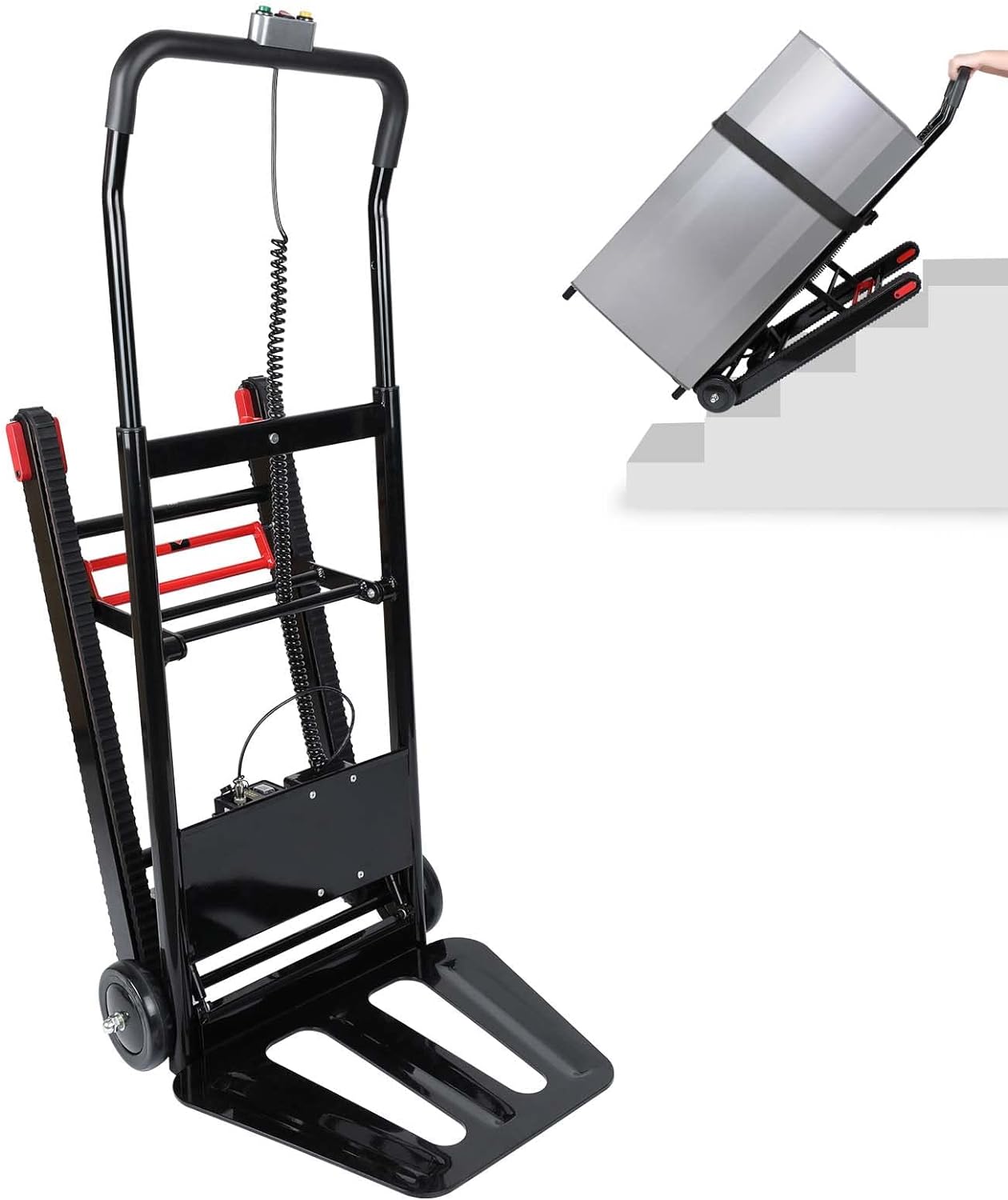 The Ecojoy stair climbing dolly's motor power allows it to go up and down stairs at a rate of 30 steps per minute and climb up to 130 floors in 3-6 hours on a full charge. The heavy-duty load capacity provides a maximum load of 160 pounds. Equipped with adjustable safety belts to help you secure cargo to the platform and prevent it from falling apart during transport. The design ensures perfect balance even with slightly heavier loads, ideal for photocopier, drinks crates, beer kegs, furniture, etc.