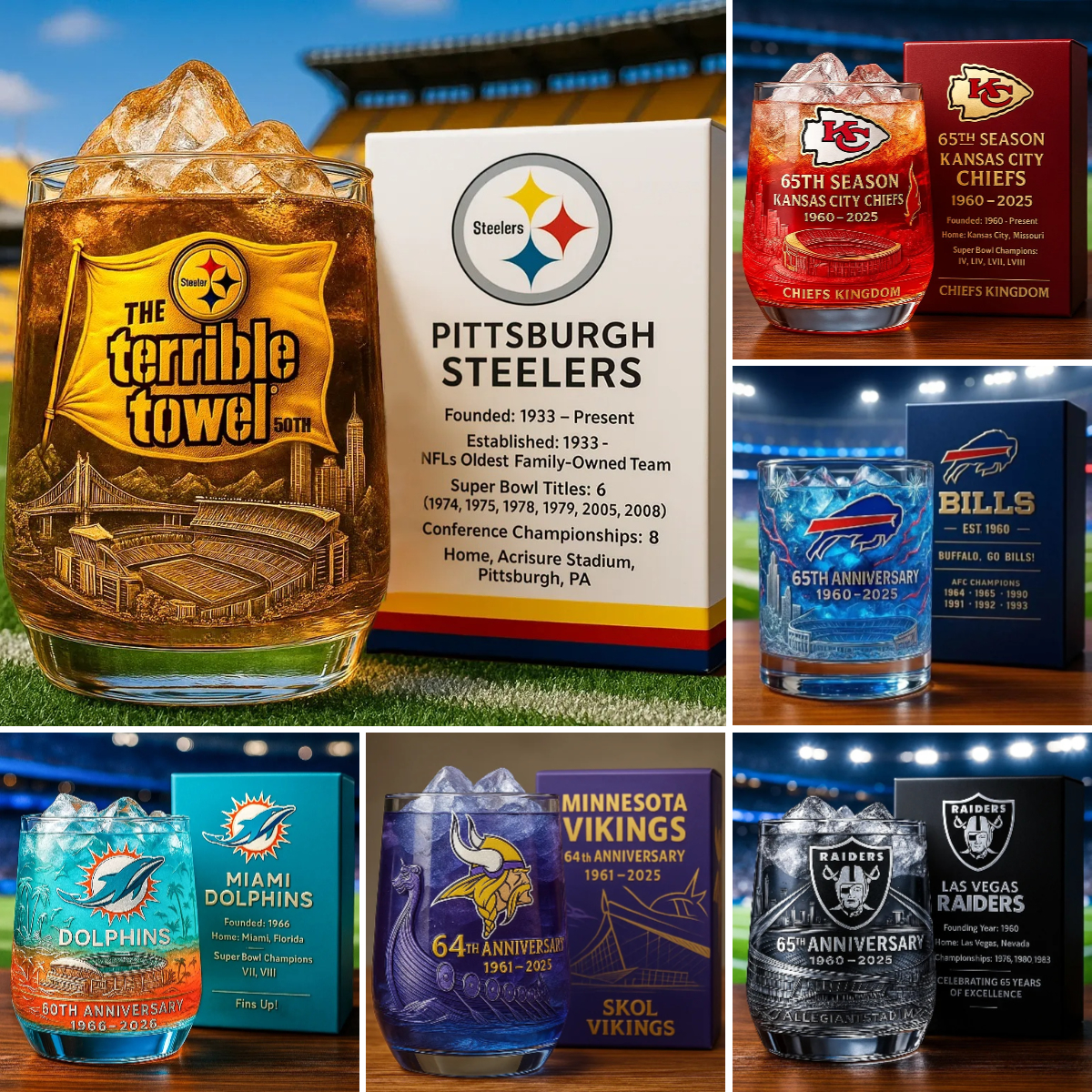 Honor the teams that shaped the game. This exclusive 32-team NFL Whiskey Glass Collection is designed for the ultimate fan, blending collectible artistry with everyday function. Each glass features iconic team logos, championship history, founding year, and special anniversary insignias—all crafted with stunning clarity and bold team colors.