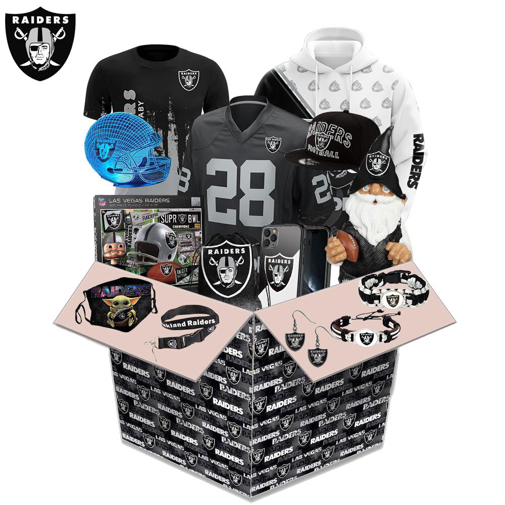 What's in the box During the festival, a limited number of Las Vegas Raiders-related products will be sent randomly. Including?hoodie,lego,characters,cup,headphones, stickers,AirPods case,iPhone case,rings,puzzles,hats,pillows, Washable mask,Outdoor magic turban and other products. All items are sent as gifts related to Las Vegas Raiders.