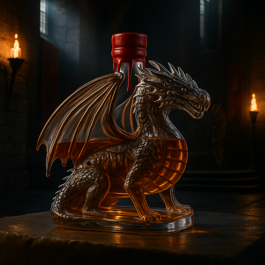 This hand-crafted whiskey decanter is inspired by the fiercest dragon from a beloved fantasy saga. With its glass body sculpted to echo the strength and grace of a fire-born beast, this bottle is more than just a vessel — it’s a tribute to power, loyalty, and the legacy of fire and blood.