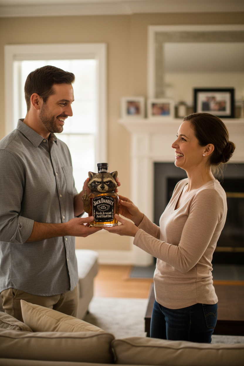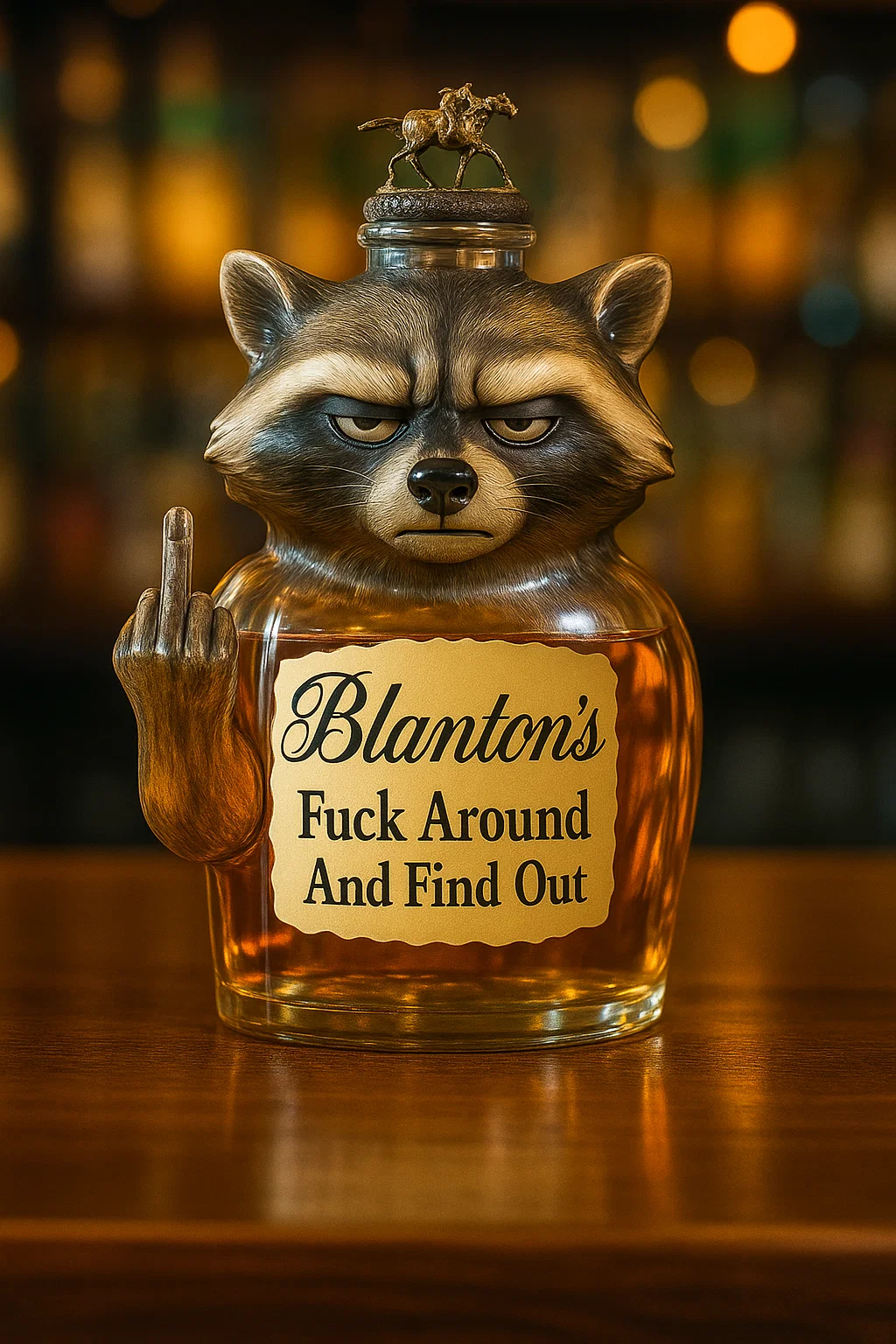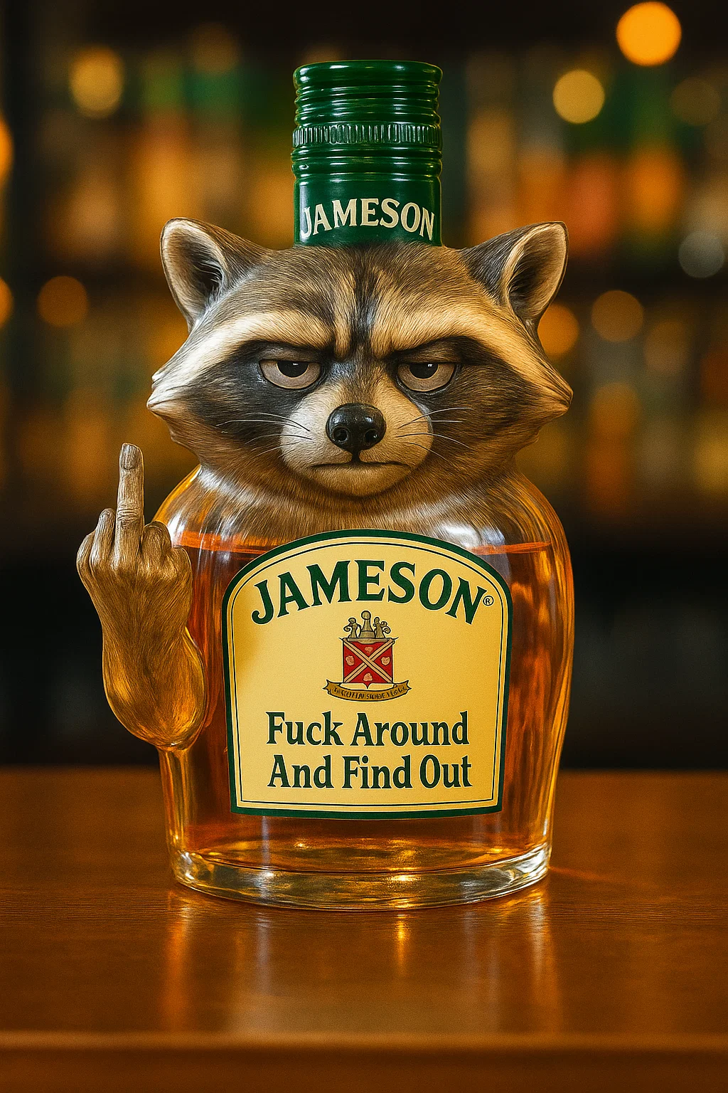 Prepare to be captivated by the “Swear Raccoon Fuck Around and Find Out” Whiskey Bottle, an undeniably unique and conversation-starting piece.
