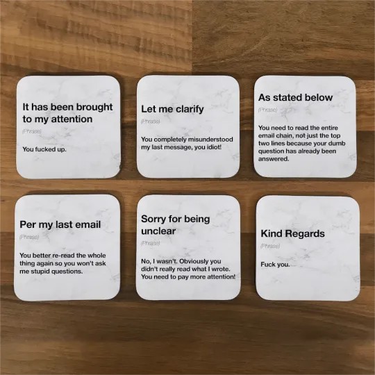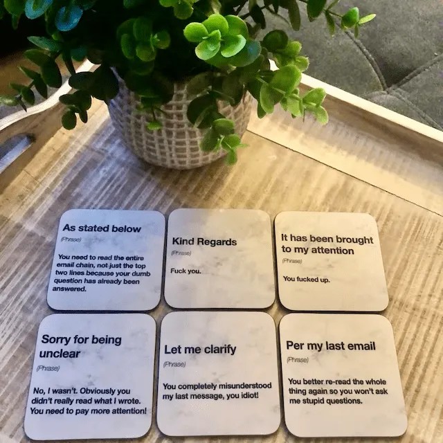 💻📧Each coaster presents a different office email term alongside a humorous interpretation. These definitions will resonate with anyone who has experienced the joys and frustrations of office communication.